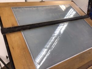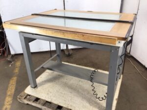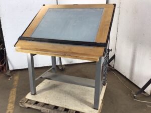 Tilt top drafting table with back lit surface – sliding straight edge – metal base – when plugged in the backlight doesn’t come on – may need a new bulb/bulbs – angle of the top is adjustable from flat to 45 degrees