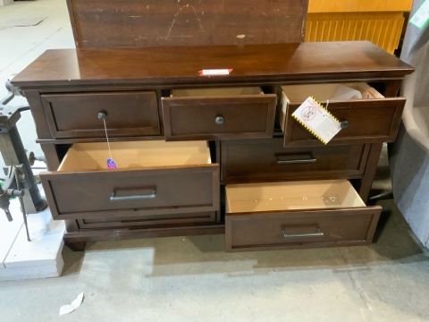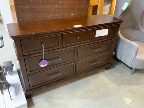 American Freight Co. 7‑drawer dresser in a rich brown finish, featuring a wide storage layout with three smaller top drawers and four spacious lower drawers. Clean lines and sturdy construction make it ideal for bedroom or guest room use.