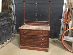 Antique Eastlake style dresser – 3 drawers with machine cut dovetails – stone top with pink and red tones – piece has some wear but is in good shape for its age – missing the mirror and one drawer pull – stone top is removable