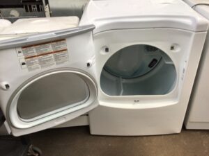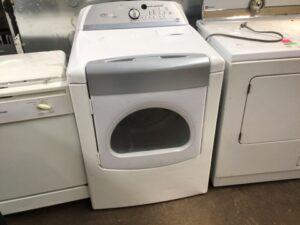 Appliance Warehouse refurbished white Whirlpool Cabrio dryer, white with silver panel. Knob selector and button controls, glass front door, . Appliance Warehouse provides a 60 day warranty on parts/labor, must register with AWh.