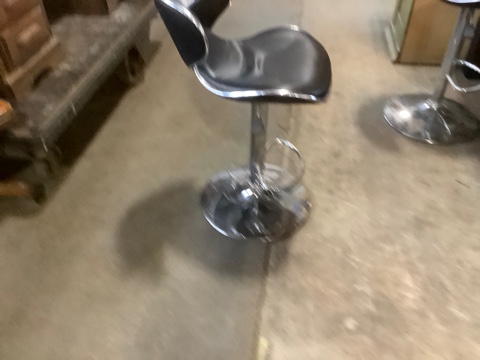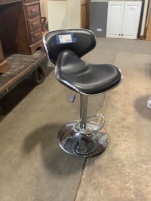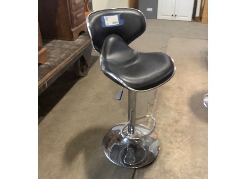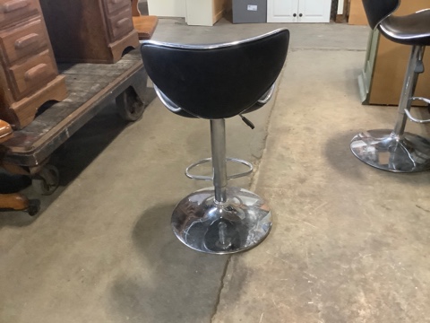 Bar Stool – Modern style with black faux leather seat and backrest. Chrome base with footrest and adjustable height. Sleek, comfy, and perfect for a home bar, kitchen island, or studio. Gently used and in good condition.