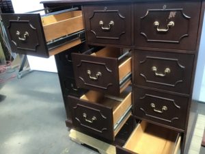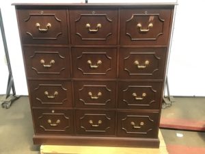 Large 12 drawer locking file cabinet. Solid wood, mahogany veneer with raised front styling, maple drawers. Includes keys. Salvaged by our deconstruction crew.