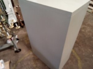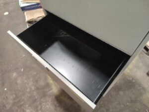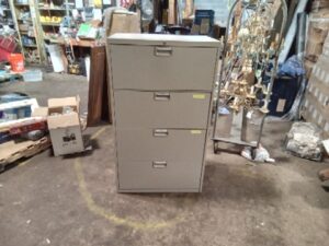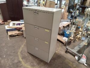 Grey four drawer lateral filing cabinet, solid bottom drawers, no key,