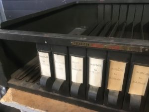 Vintage Lab Aid steel Slide File System stacking drawer unit. Technicon Histology File, 14 slots, missing 3 drawers. 11 drawers with label holders, green finish.