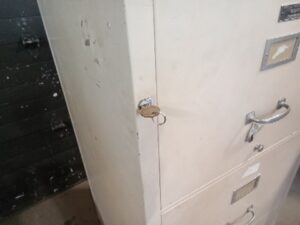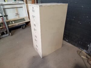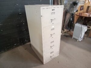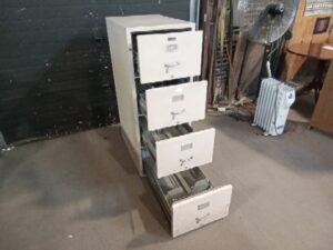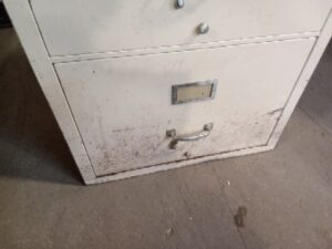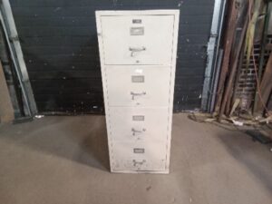Vertical File Cabinet – Shaw Walker Fireproof – 4 Drawer – includes key – has moderate wear around the bottom and sides – extremely heavy