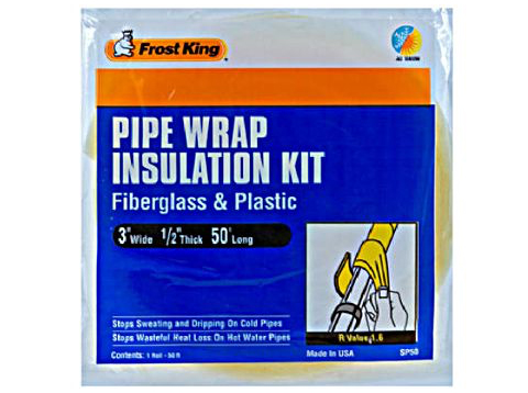 Still in package, new old stock Frost King fiberglass pipe wrap insulation kit. 50ft long.