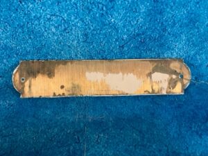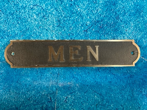 Vintage Brass ‘Men’ Restroom Sign – classic design, approx. 2″ x 10″. Solid brass plate with aged patina. Ideal for architectural salvage, décor, or door hardware replacement. Great vintage look.