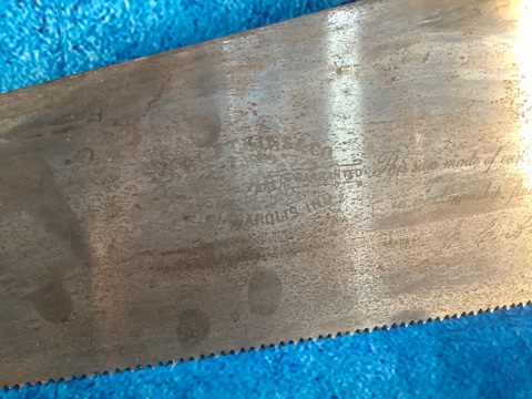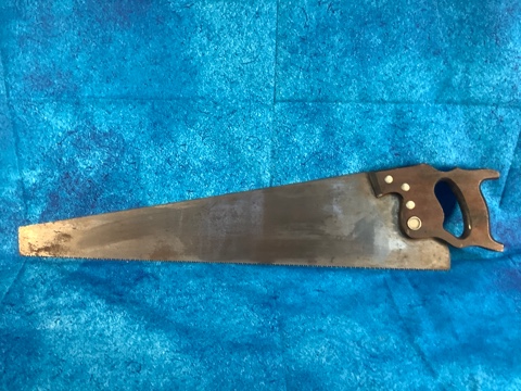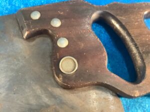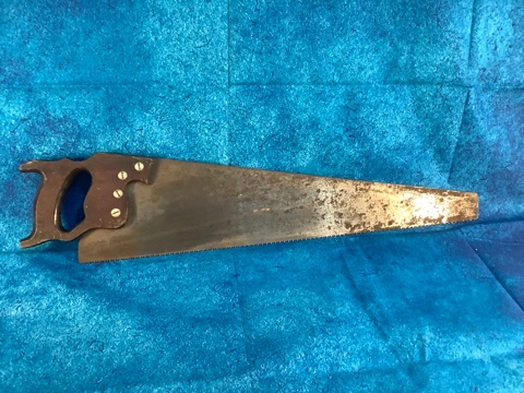 Vintage 26″ EC Atkinson handsaw with original logo still visible on the blade. Shows use with some surface rust, adding to its antique charm. A great piece for collectors or woodworking enthusiasts. Sturdy handle and classic design.