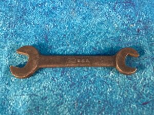 Vintage Ford Branded Open End Wrench – Rare piece with 1/2″ & 5/8″ openings. Classic tool for collectors or mechanics. Durable steel, unique patina, and Ford logo make it a standout. Great for display or use. Authentic vintage garage find!