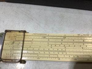 Keuffel & Esser Slide Rule w/ Case – Classic vintage calculating too,. Includes original protective case. Great for collectors, display, or math history enthusiasts. Shows light wear consistent with age. Case marked AB Smith – PIttsburgh