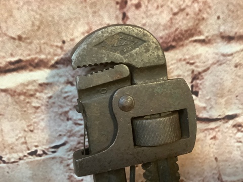 Vintage 9-inch Stillson pipe wrench with a classic wooden handle. Durable design with a freely turning adjustment nut for easy use. Shows signs of age and wear, adding to its character. A great addition for collectors or practical use.