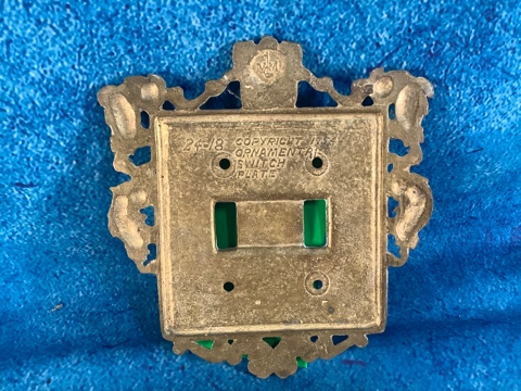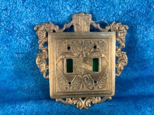 Virginia Metalcrafters Brass Ornamental Double Switch Plate Outlet Cover. This decorative switch plate is crafted from brass and features an ornamental design, adding a touch of elegance to any room.