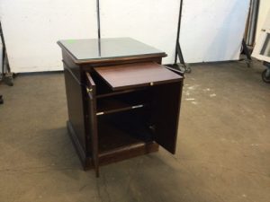 A traditional styled side table, glass top with 2 door storage and pull-out writing extension. Solid wood with veneer, brass finish knobs.