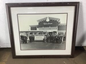 Framed print of Bob Evans Restaurant with a tour bus in New Castle, PA, 1950s. A charming vintage piece capturing mid-century Americana, perfect for collectors or decor enthusiasts seeking nostalgic artwork.