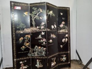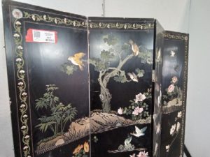 Oriental themed 4 panel room divider. Original finished, good condition. hand painted, carved, very heavy and sturdy, Some heavy nicks and scratches. Measurement is fully open.