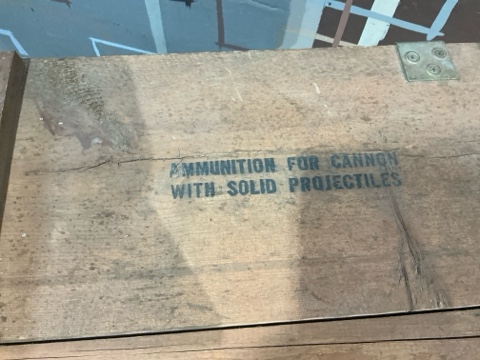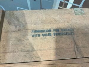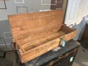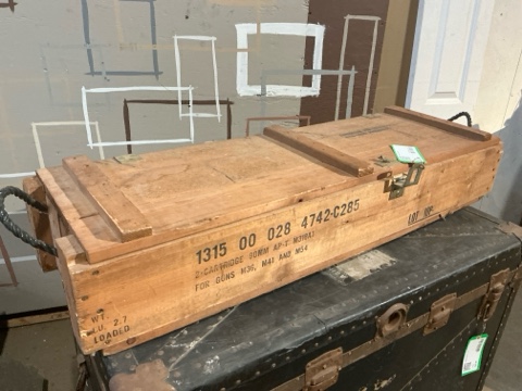 Large wooden ammo box with rope handles and bold original signage. Solid construction with industrial character. Measures approx. 44” L x 14” W x 8-1/2” H. Great for storage, display, or vintage military decor.
