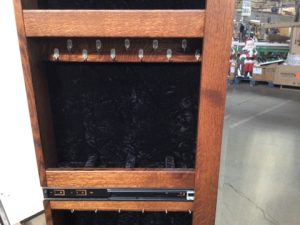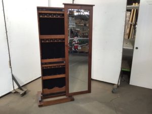 Cabinfield Jewelry Storage Sliding Cheval Mirror with Full Base – Very good condition – Sliding leaner mirror includes a hidden jewelry organizer. With hooks for over 20 necklaces, a shelf just for rings, 2 more shelves, and a bottom section. Oak