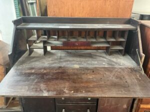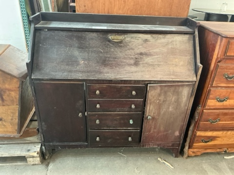 Handmade solid wood secretary desk featuring drop-front writing surface, cubbies, drawers, and cabinet storage. Classic vintage style for home or office. Measures 47.5″ L x 16″ W x 46.5″ H.
