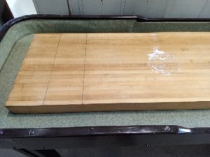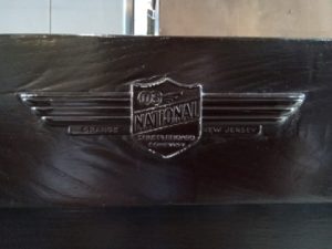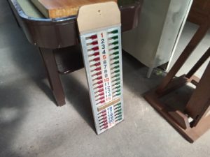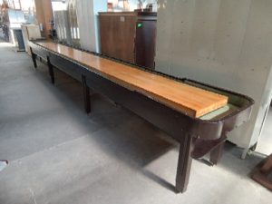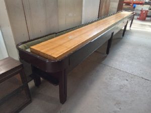 National Shuffleboard Company. Shuffleboard was originally a social hall in Claridge, PA. Base can be taken apart. Solid Maple board is one piece. Scoreboard and pucks included.