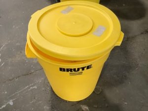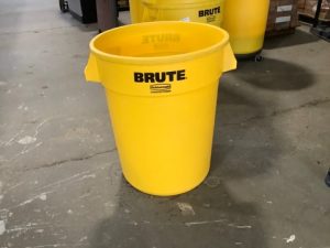 Rubbermaid Brute 32 gallon round trash can with lid. Heavy duty yellow plastic, very lightly used.