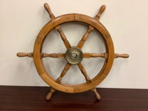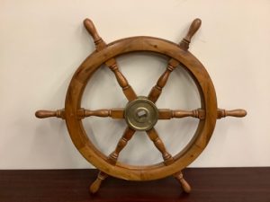 Six spoke ship wheel with brass center hub – 27” diameter approximately 2” thick