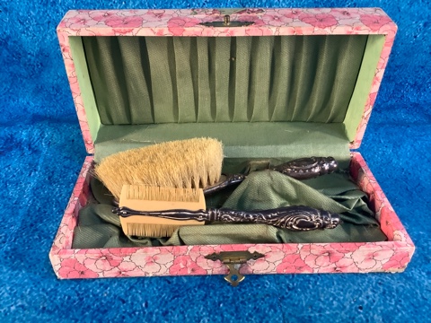 Victorian Brush & Comb Set from the 1890s. Beautiful original patina. Comes in a charming, decorated box—perfect for collectors or vintage decor lovers. A true piece of history in excellent condition!