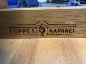 Coppes Napanee 2 drawer and 2 door double kitchen base cabinet with pull-out extendable prep table. Raised panel drawer fronts in Cinnamon Frost finish, oak drawers.