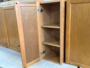 9 wall cabinets and 7 base units including 1 blind corner. Solid oak doors and drawer fronts