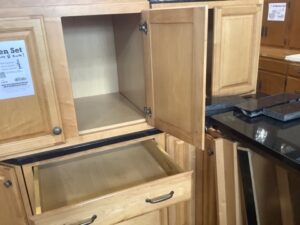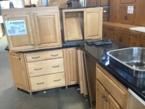 Salvaged 9pc KraftMaid kitchen cabinet set in a warm honey finish. Includes 3 wall cabinets, 5 base units, and 1 pantry. Comes with L-shaped granite countertop and an undermount stainless steel sink. Solid construction with classic appeal.