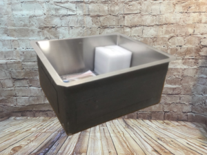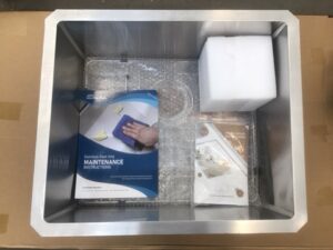 Sarlai under-mount stainless steel kitchen sink, durable and rust-resistant for lasting performance. New, never installed, with a sleek, modern design. Includes strainer basket for easy waste disposal. Perfect for any kitchen renovation.
