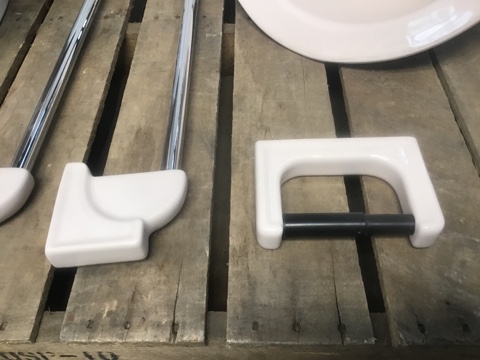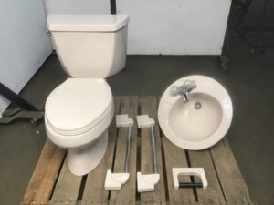 Toilet – Sink w/Faucet – Toilet Paper Holder & 2 Towel Bars