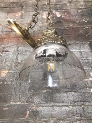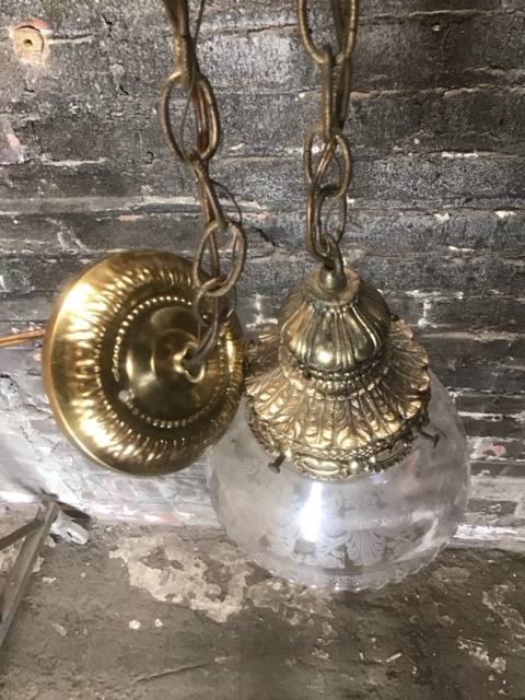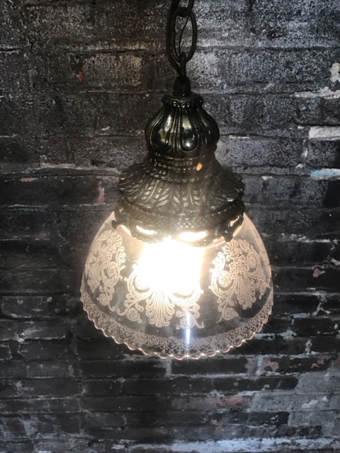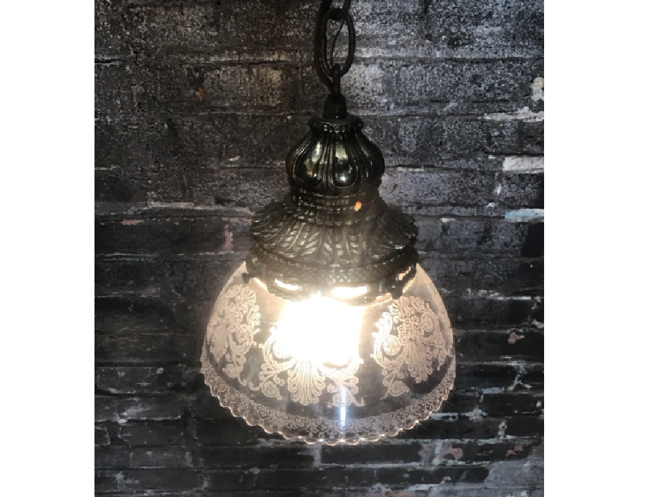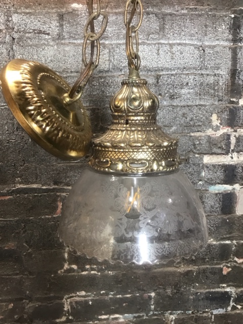 Brass pendant light with etched glass shade, includes 30″ steel chain and canopy. Vintage-inspired hanging fixture adds warm, elegant illumination to any space. Perfect for entryways, dining rooms, or stylish home décor upgrades.