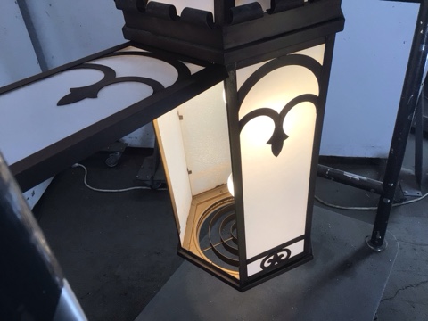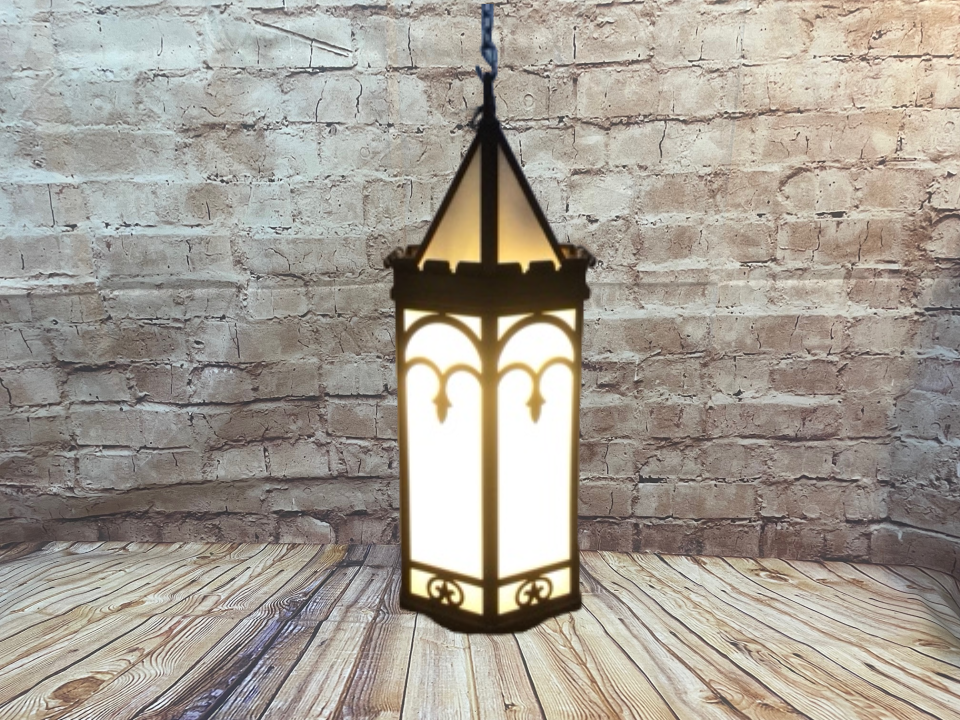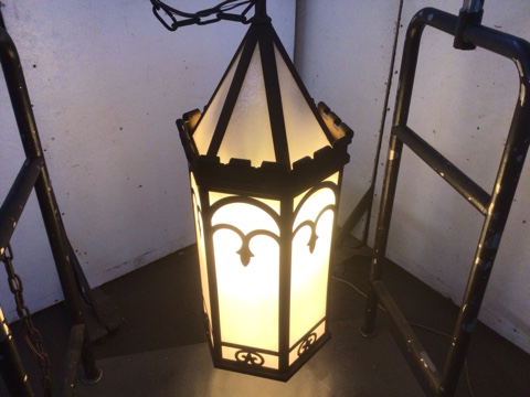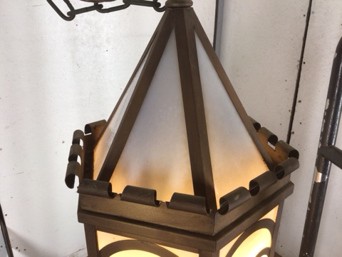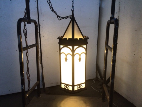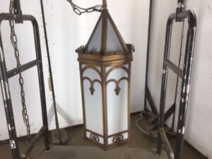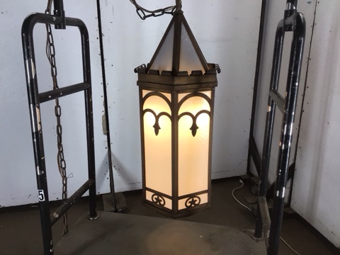 Vintage gothic style church pendant – uses 4 light bulbs – includes a mogul base adapter – long chain for hanging from high ceilings – steel and textured milk glass exterior – wired for display at CJ only – should be inspected before installation