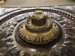 Antique ceiling tin medallion with center light fixture – paint has crackled with age – some edges are bent