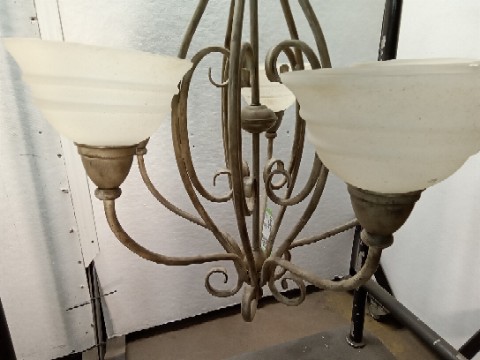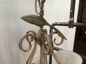 E13580-PT. Brushed painted metal arm Chandelier with 5 upturned Globes and feather ornament top