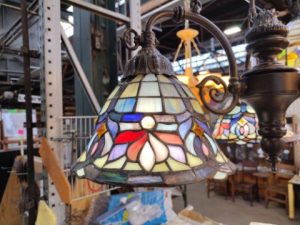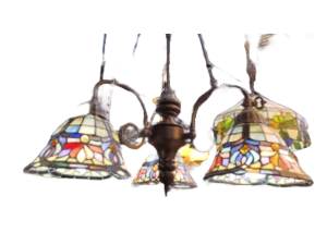 Three stained glass globe chandelier down turned. Purple and red and white glass. With brown curled chandelier frame.