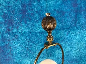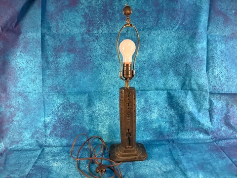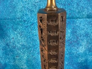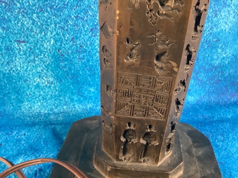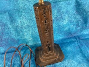 This antique Asian-inspired table lamp features a hexagonal base and body, intricately carved with detailed figures and symbols, possibly of Chinese or Japanese origin. A beautiful blend of craftsmanship and cultural artistry. Needs a new plug.
