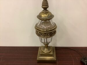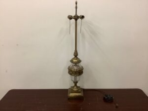 Brass and crystal table lamp – brass shows some tarnish. Tall 36”+ See no markings but definitely Stiffel style. UNTESTED