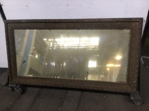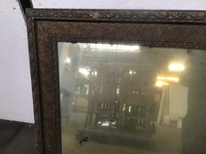Vintage rectangular glass mirror with ornate wooden frame. 1″ thick frame, nouveau style detail with swirl pattern, beading and floral knot-work design, plain glass. Some damage and wear to the frame and glass.