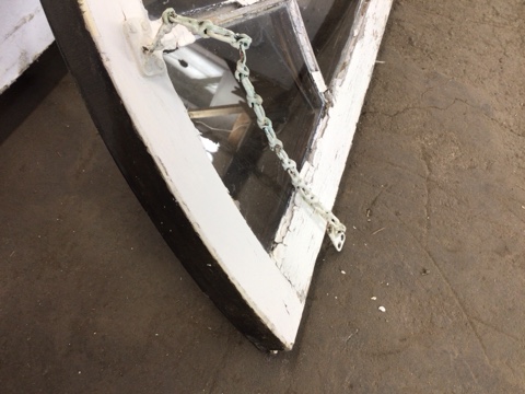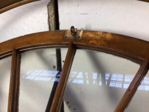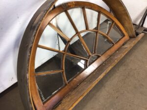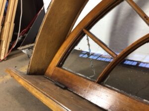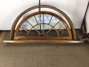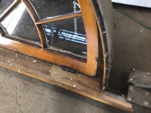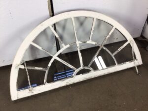 Antique arch shaped window with partial casement – exterior facing casing isn’t included – solid maple frame and window sill – exterior facing side of window is heavily worn with chipping glazing – salvaged by our deconstruction team