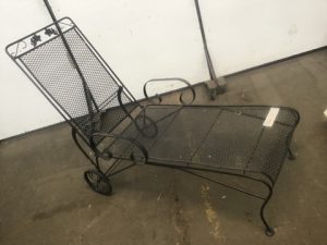 Adjustable patio chaise lounge chair. Traditional style steel frame with expanded mesh, scroll and leaf detail, wheels. Multi-position adjustable back, black finish.
