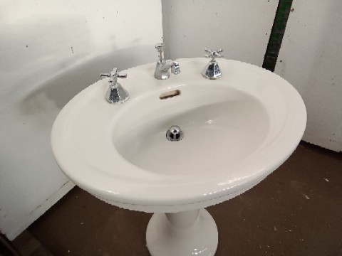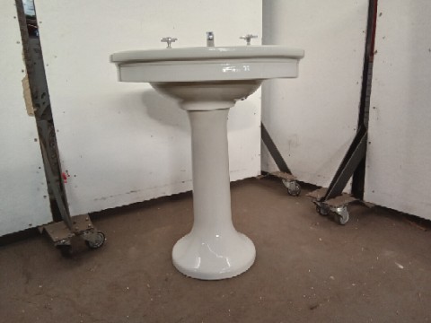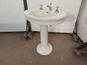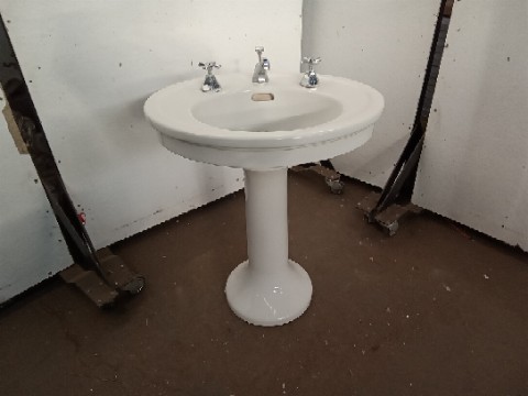 Antique porcelain Pedestal Sink – oval shaped Sink- curved Round base – original hardware – there’s a crack in the sinktop near the hot water adjustment knob – salvaged by our deconstruction team