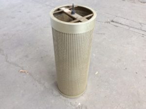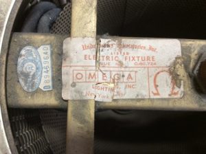 Mid-Century Modern style commercial hanging ceiling pendant light. Circa 1966, cylindrical metal shade with mesh insert, dual uplight/downlight standard bulb sockets. Made by Omega Lighting, NYC. Brass/brass finish. Salvaged by our deconstruction crew.