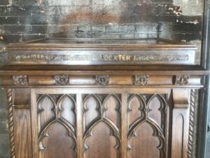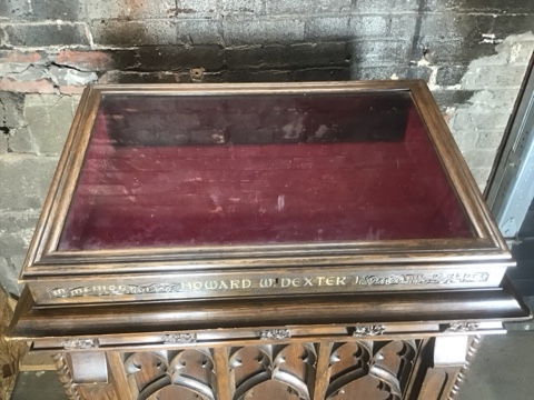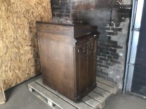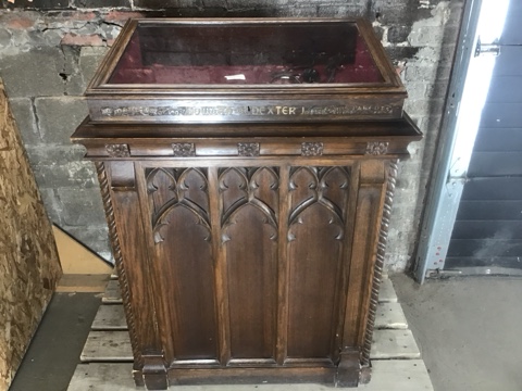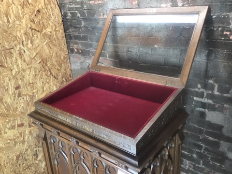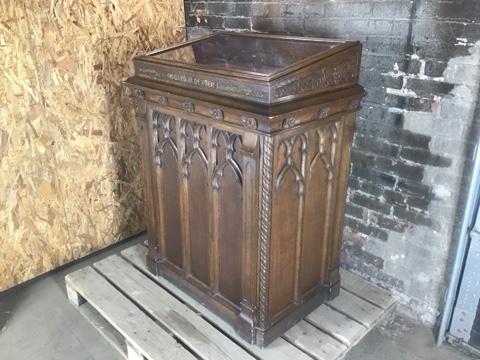Gothic Revival lectern display cabinet featuring carved wood panels and architectural detailing. Solid, stately construction with glass top display surface. Measures 32″ L x 21″ W x 43″ H. Ideal for church, library, or historical décor displays.