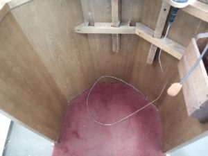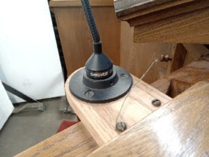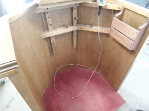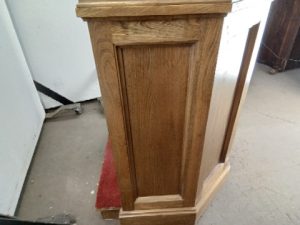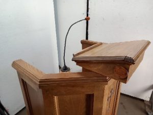 Solid oak church Pulpit- built in microphone (untested) – book/paper rest can be moved off center – carpeted Base – in good shape – very light wear