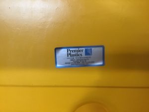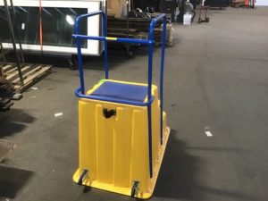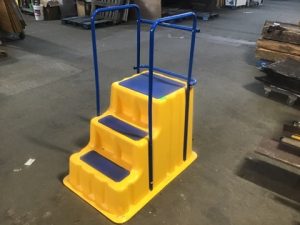 Premier Plastics brand 3 step box step stool. Yellow polyethylene with blue non-skid rubber bumpers, wheels and steel safety railing. 30in top step height.