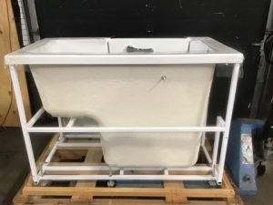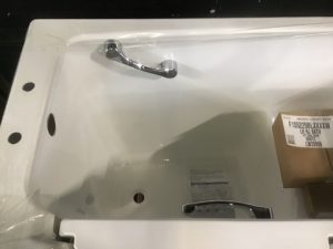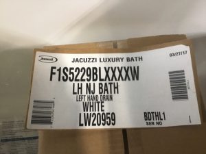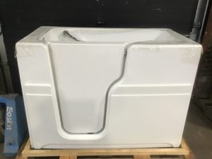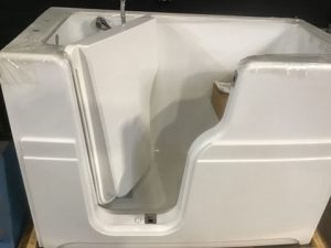 Surplus Jacuzzi non-jetted walk-in soaking bathtub. Right hand contoured seat, 2 grab bars, knee-notch curved door. Fiberglass shell in white color, steel frame with leveling feet, left hand drain. Includes drain and tempering valve. Faucet not included.