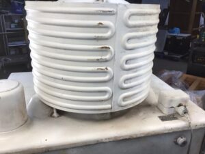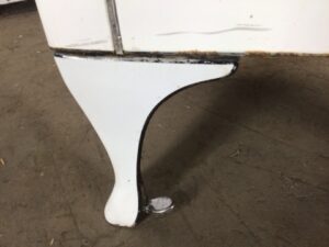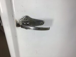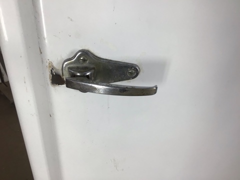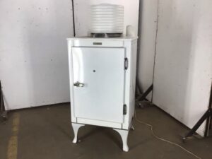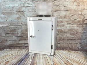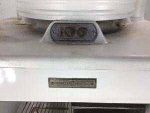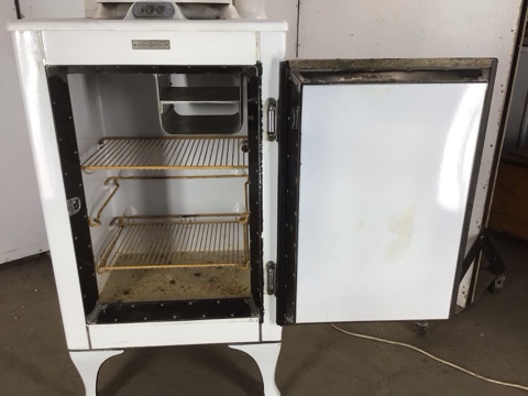 Antique GE Monitor Top Refrigerator – porcelain enamel sides, legs, and interior – chrome handle/ door latch with foot pedal for opening with full hands – in great shape for its age and could be a unique storage cabinet or bar – sold AS IS