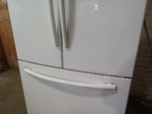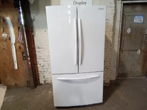 White Saumsung refrigerator With Upper refrigerator and freezer drawer – has some small dents and scuffs on the doors – plugged in and froze water – sold as is