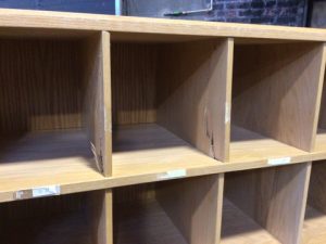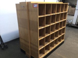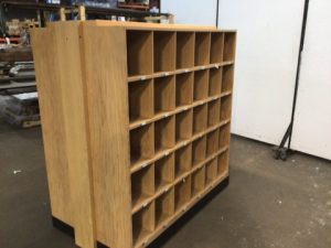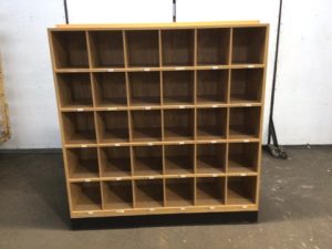 Double-sided pigeonhole mobile organizer/mailbox cabinet. 30 9”x10” cubbyholes per side. Mixed wood with veneer. Typical Wear.